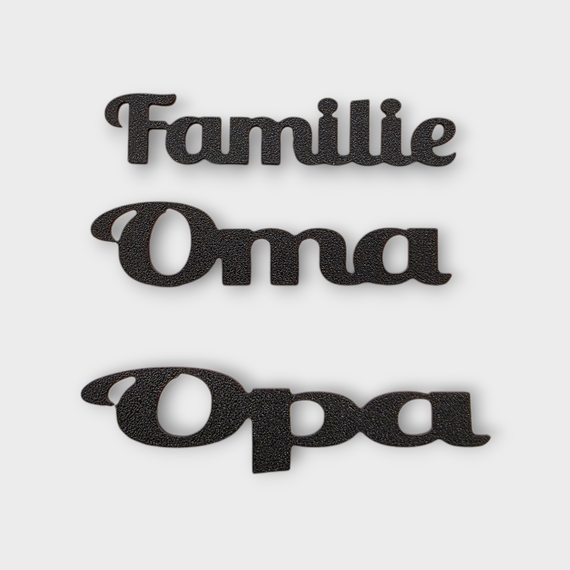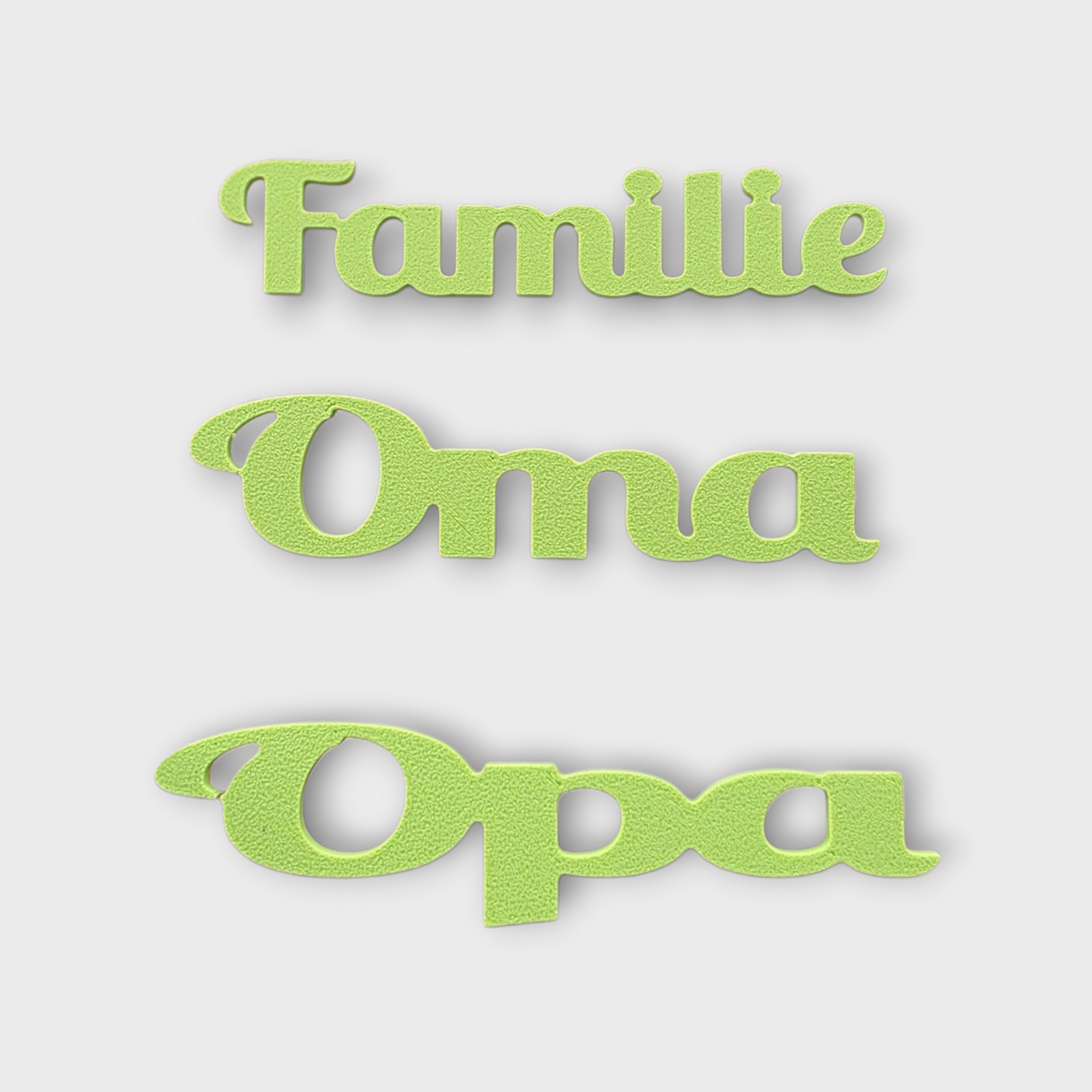 Die Schriftzüge Oma, Opa und Familie sind Steck-Elemente, die exakt in die vorgesehenen Steckplätze deiner Moments-Rahmen passen – sauber, sicher, perfekt abgestimmt.